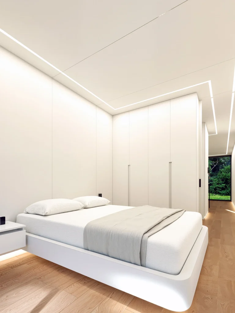 Schwimmende Elemente, indirekte Beleuchtung und Natursteinverkleidungen für ein raffiniertes tägliches Ritual.